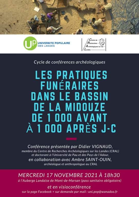 De non mancar pas, dimècres 17 de noveme de 2021 a 18ò30 : « Les pratiques funéraires dans le bassin de la Midouze de 1000 avant à 1000 après J.-C. », per l’Université populaire des Landes e lo CRAL !