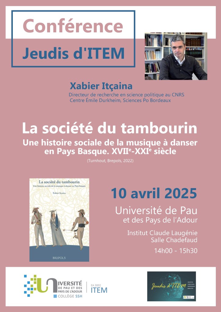 Sa conférence portera sur la présentation de son ouvrage « La société du tambourin. Une histoire sociale de la musique à danser en Pays Basque – XVIIe-XXIe siècle » paru aux Editions Brepols en 2022.