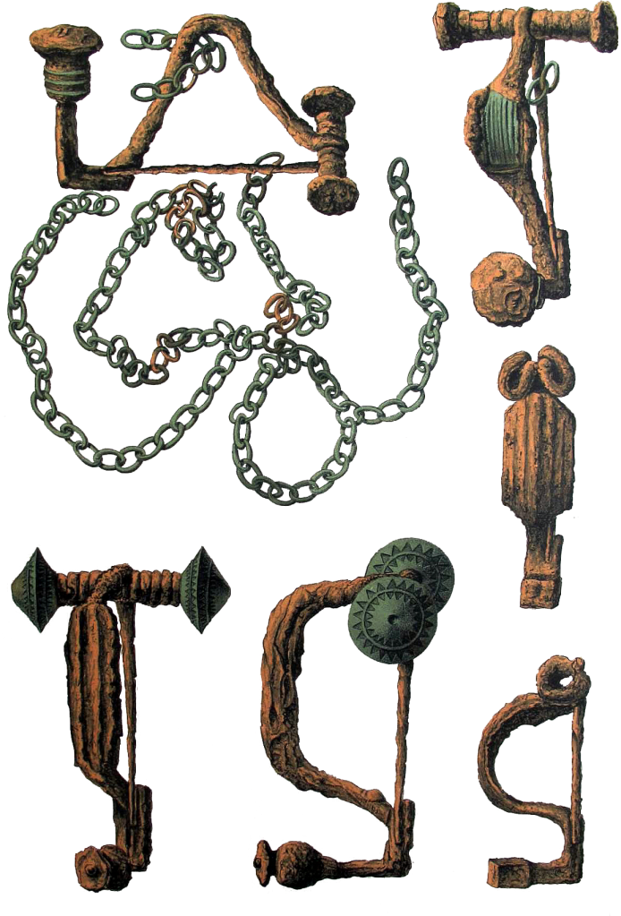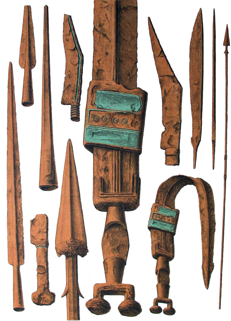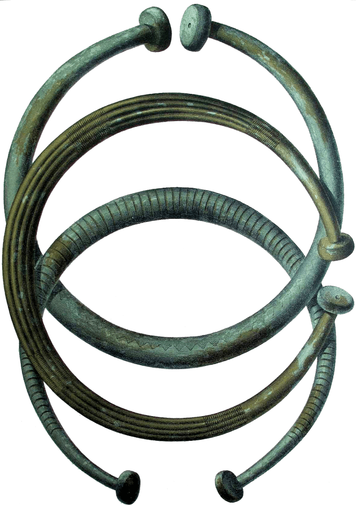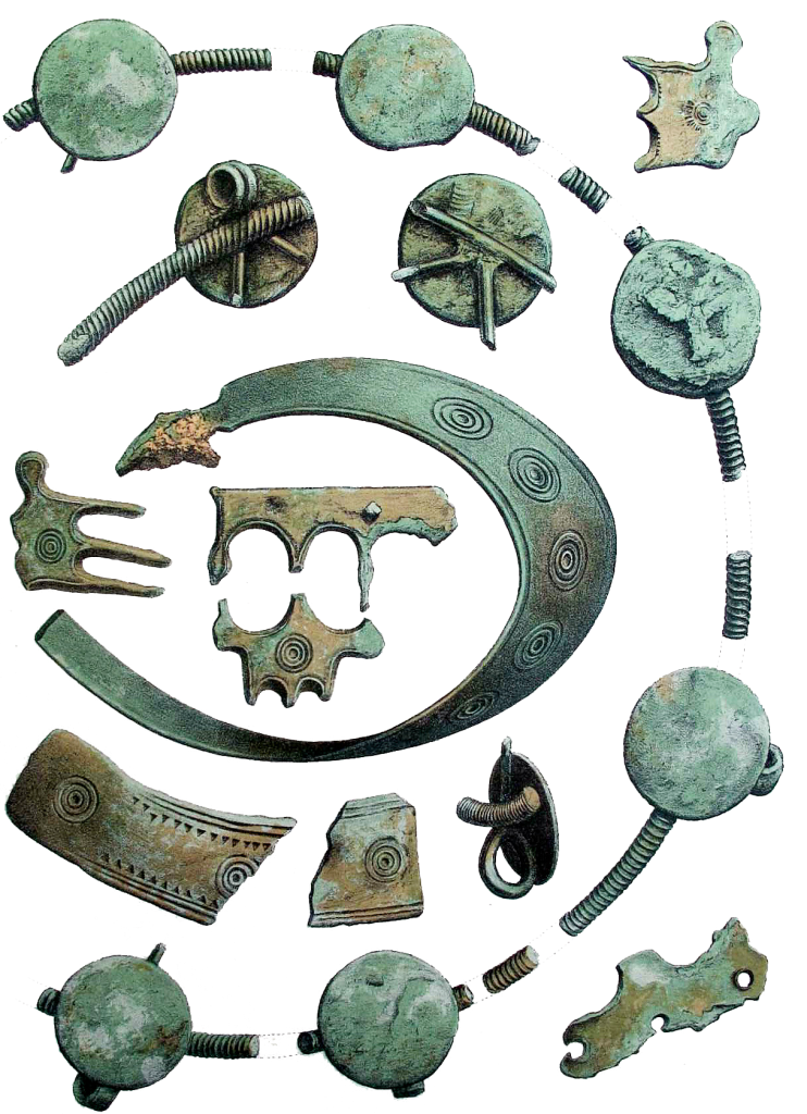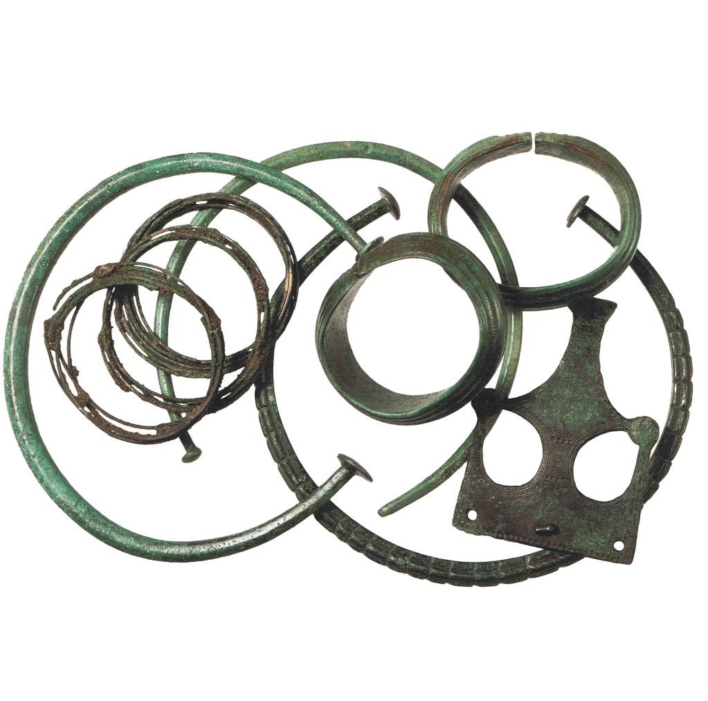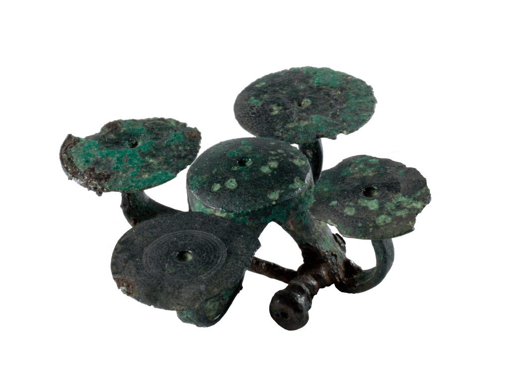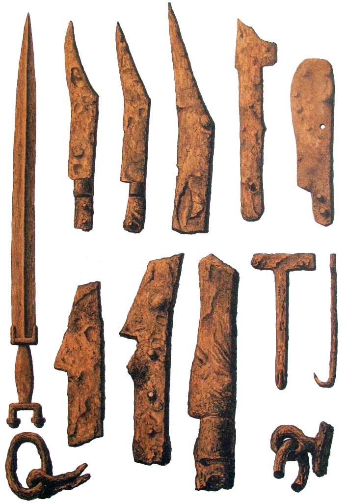 Cette dernière était consacrée à la production d’objets de coquetterie (pince à épiler) et d’éléments de parure tels que des torques, des bracelets, des agrafes de ceinture, divers boutons, épingles et rouelles et, seulement au second âge du Fer, des fibules. Celles-ci étaient jusqu’alors entièrement en fer, matière dans laquelle étaient aussi réalisés des objets du quotidien (rasoirs), des outils (couteaux, forces) et des armes (épées, fers de lance, javelots, pointes de flèche, poignards, éléments de bouclier, casques, cottes de maille).