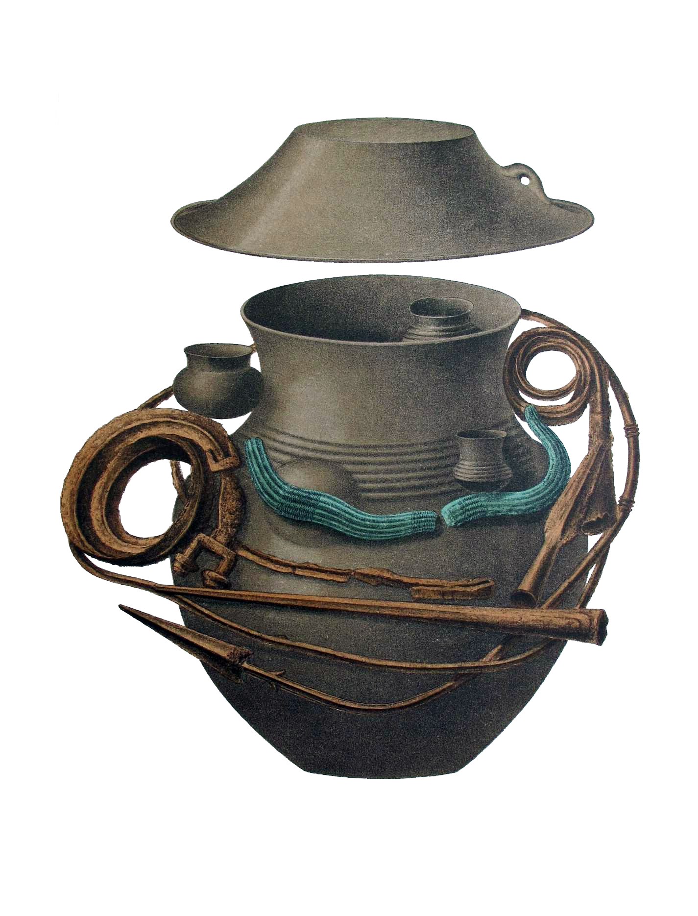 Comme l’avait remarqué Pierre-Eudoxe Dubalen, pionnier de l’archéologie landaise, l’âge du Fer en Gascogne et Pays basque est une période essentiellement documentée par le monde des morts. Contrairement au reste de l’Europe occidentale, une seule pratique funéraire est connue durant toute la période : la crémation. Une fois le bûcher terminé, une partie des os était méthodiquement sélectionnée (les plus gros, comme le crâne), lavée puis disposée dans une urne surmontée d’un plat retourné en guise de couvercle. En fonction des siècles et du statut social du défunt, différents dépôts – souvent sacrifiés, brisés – pouvaient accompagner les sépultures : armes (épées, javelots, lances, couteaux, boucliers), outils (fusaïoles), bijoux et instruments personnels (fibules, bracelets, torques, pinces à épiler), ainsi qu’un ou plusieurs petits vases-accessoires contenant probablement des offrandes dont la nature ne nous est pas parvenue. Soit autant de témoins indirects riches en informations au sujet des pratiques, techniques et technologies qui existaient au moment de l’enfouissement (tissage, poterie, métallurgie…).