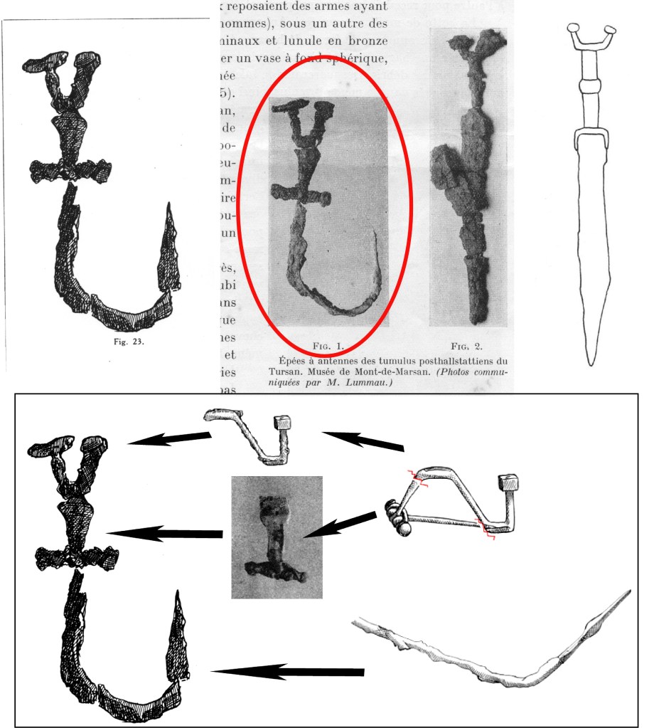 II convient d’évoquer ici une autre supercherie sans doute assumée que l’on doit à Dubalen. Dans l’ouvrage collectif Nos Landes, publié en 1927, Dubalen fait figurer le dessin (fig. 23, p. 59) d’une bien curieuse épée à antennes, alors exposée au musée et censée provenir d’un tumulus du Tursan (Fig. 12). Il s’agit en réalité non pas d’une épée à antennes, mais d’un astucieux montage utilisant trois objets en fer rouilles et déformés : une première fibule en guise d’antennes, une deuxième en guise de poignée et de garde et une probable extrémité de javelot en guise de lame ! On se demande ce qui a bien pu pousser Dubalen à ce montage, sinon une fois encore le désir de vouloir montrer la richesse des tumuli du Tursan. Si la protohistorienne Gabrielle Fabre a été abusée (Fabre, 1952, Fig. 1 p. 61), l’attention des chercheurs modernes n’a pas été prise en défaut.