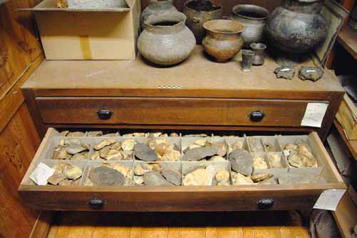 Le volume occupé par les objets de fouille finit par devenir conséquent. Dans les mêmes salles, ces derniers côtoient tantôt des œuvres d’art, tantôt des pièces géologiques ou des collections d’entomologie. De quelques séries de bifaces, pointes de flèches et haches polies à l’époque du théâtre, on est désormais passé à un musée à vocation patrimoniale généraliste. La section archéologique comprend des séries typologiques détaillées pour le Paléolithique inférieur ou moyen (industries dites Chelléennes et Chalossiennes, termes abandonnés depuis), le Paléolithique supérieur (où l’os abonde en plus des outils en silex, sans oublier des plaquettes gravées). Le Néolithique est bien représenté avec des séries de haches polies (Fig. 10). D’un point de vue volumétrique, c’est incontestablement l’Âge du Fer qui domine avec le mobilier funéraire issu de la fouille des tumuli du sud des Landes. Quelques meules à grain rotatives de la période antique, ainsi que de la céramique et des lampes de la même époque sont aussi à mentionner, ainsi que, à l’instar de beaucoup de musées de l’époque, quelques objets exotiques : des dizaines de flèches, perçoirs, perles en coquille d’œuf d’autruche de la région saharienne (probablement Bab-Merzouka).