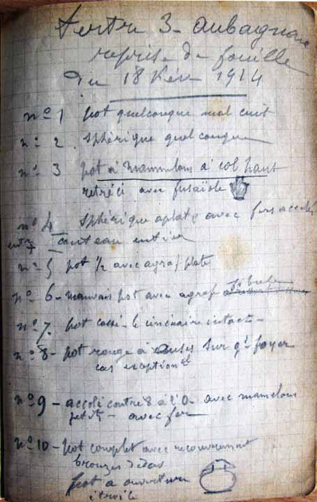 Dans ses carnets, tout est noté, de la profondeur des vestiges à la couleur des sols rencontrés. De véritables coupes stratigraphiques sont même réalisées, ainsi que des plans sommaires de chaque tertre avec l’emplacement des urnes funéraires (Fig. 7).
