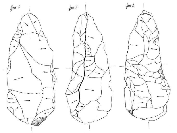 Le dernier combat de Dubalen sera celui de la reconnaissance d’un nouveau faciès du Paléolithique, le « Chalossien ». Créant ce concept en 1923, il veut absolument démontrer que la Chalosse a été le siège d’une industrie originale de la pierre parmi les plus anciennes développées par l’Homme, dont l’outil caractéristique serait le trièdre (Fig. 8). Mais la question fait débat à la Société Préhistorique Française dont quelques membres veulent s’assurer de l’authenticité d’une telle industrie. L’un d’eux, André Vayson de Pradenne, effectue une visite en 1927 dans les Landes. Celui-ci est très critique lorsqu’il rend compte de son inspection des collections du Musée de Mont-de-Marsan, puis des terrains ayant livré les pièces en cause. Il explique dans le détail les problèmes liés à la détermination d’un supposé faciès chalossien : les rapprochements morphologiques ne tiennent pas compte d’aspects technologiques d’une part, et d’autre part les objets proviennent de ramassages de surface et non de réelle position en stratigraphie (Bulletin de la Société Préhistorique Française d’octobre 1930). Recevant le renfort du préhistorien basque Eugène Passemard, Dubalen s’accrochera pourtant à ce concept de Chalossien jusqu’au bout ; mais les progrès de la recherche auront raison du Chalossien, qui n’a pas d’indépendance véritable.