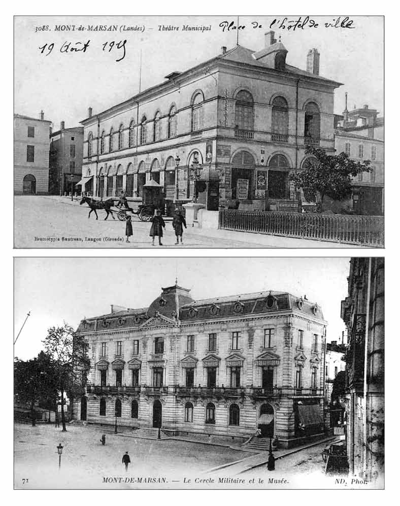 En 1885, Dubalen installe sa collection archéologique, déjà riche de plusieurs centaines d’objets, dans le local que lui fournit la ville de Mont-de-Marsan. C’est le premier acte de la création du Musée. L’année suivante est créé un musée municipal à partir de cette collection et de celles d’histoire naturelle. Le muséum d’Histoire Naturelle est aménagé dans une pièce du théâtre municipal (Fig. 10). Il y reste une quinzaine d’années, avant de devoir déménager. En effet, le local ne permet plus d’accueillir les nouveaux objets issus soit des recherches de Dubalen, soit d’achats divers (animaux naturalisés) ; en 1889, le Conseil Général des Landes autorise le Musée à récupérer les collections de minéralogie et de paléontologie réunies par André-Eugène Jacquot et Félix-Victor Raullin pour l’établissement de la carte géologique du département. Le transfert s’impose : il a lieu au tout début du XXe siècle, dans le « Palais Pascal-Duprat », actuel Hôtel de Ville, alors aménagé pour accueillir le mess des officiers. Tout le deuxième étage sera consacré aux collections rassemblées par Dubalen (Fig. 9).