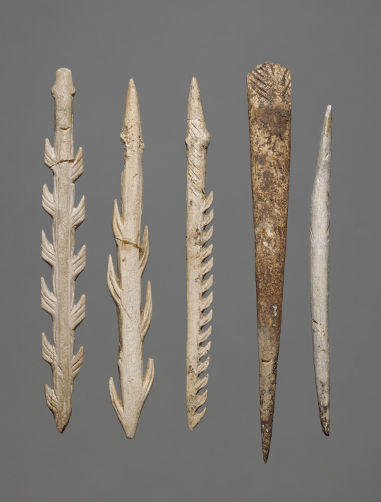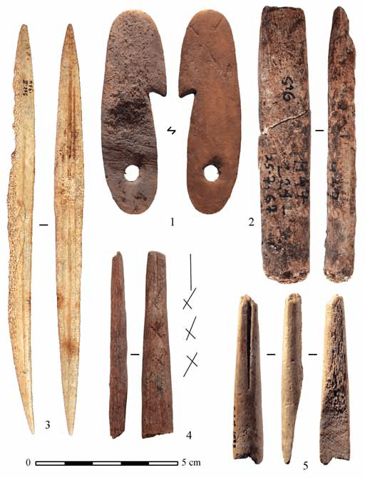 1: crochet de propulseur (Roc-de-Marcamps). 2 : outil biseauté (Saint-Germain-la-Rivière). 3 : pointe de projectile (Isturitz). 4 : fragment de pointe de projectile à décor de croisillons (Saint-Germain-la-Rivière). 5 : pointe de projectile de type Lussac-Angles (Isturitz).
