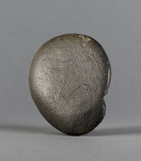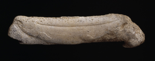 Parallèlement à la raréfaction du travail des matières osseuses, qui demeure essentiellement représenté par des poinçons en os et des têtes de harpon en bois de cerf42, et à un resserrement fonctionnel des outillages lithiques autour des pièces esquillées, grattoirs, couteaux et pointes à dos, nous pouvons rappeler le phénomène de galets gravés ou peints bien documenté dans l’Azilien classique pyrénéen43.