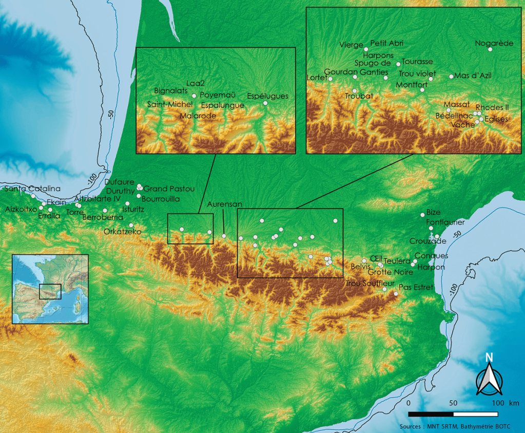 À la différence du nord de l’Aquitaine, où des séries livrent des morphotypes de pointes lithiques aisément différenciables et permettant de sérier le Magdalénien supérieur en différentes phases27, nous appréhendons le Magdalénien supérieur du versant nord des Pyrénées comme un seul ensemble, bien que certains morphotypes osseux permettent de nuancer cela (notamment les pointes à base fourchue, présentes à la charnière entre Magdalénien moyen récent et Magdalénien supérieur mais disparaissant ensuite28). Au sein de toute la chaine pyrénéenne, comme pour le Magdalénien moyen récent, le Magdalénien supérieur sensu lato a été fortement recherché et fouillé depuis le début du XXe s., ce qui aboutit à une carte de sites très dense.