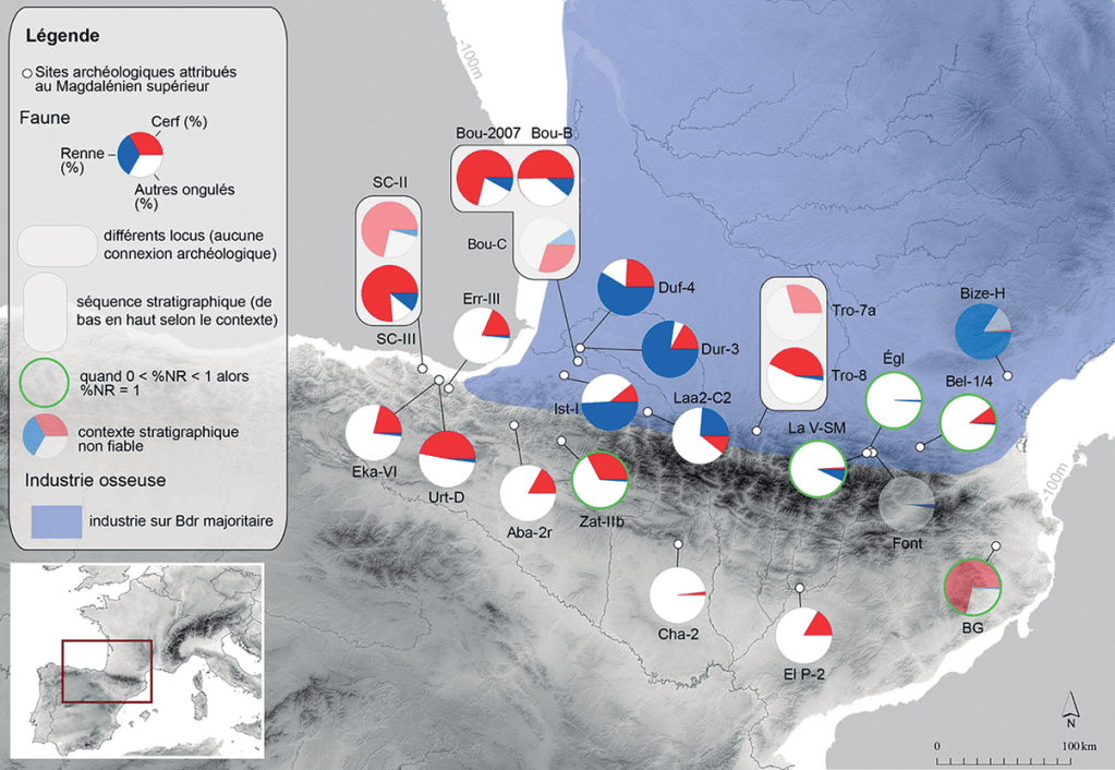 Le Magdalénien moyen récent représente un temps fort du Paléolithique récent nord-pyrénéen avec de nombreux sites révélés à partir de fouilles anciennes et modernes, voire en cours. À l’échelle de la moitié ouest de la France, la répartition des sites datés du Magdalénien moyen récent permet d’observer une discontinuité à l’échelle du peuplement magdalénien. En effet, autour de 17000 cal BP, les sites sont absents de la plaine nord-aquitaine jusque vers le nord du seuil du Poitou20. Cette lacune ne résultant pas de l’état de la recherche (éventuel biais de prospection, d’identification, etc.), il semble donc que ces zones aient été marginalisées à cette période. Il est alors possible que des populations se soient repliées dans des espaces aux topographies plus contrastées, le piémont pyrénéo-cantabrique constituant alors le cœur de l’aire culturelle du Magdalénien moyen récent. Le rôle des effets climatiques et environnementaux de l’évènement de Heinrich 1 dans cette situation reste à préciser21.