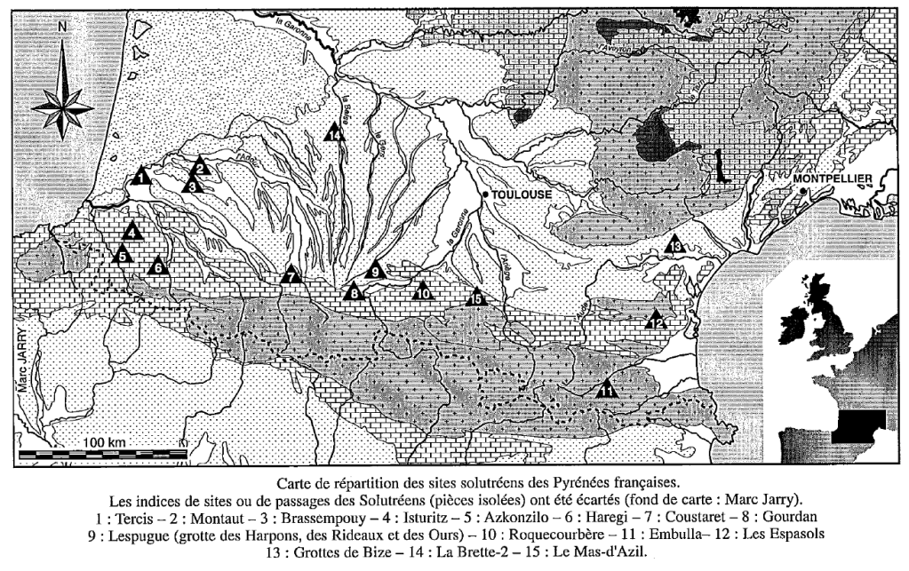 Malgré les difficultés que posent les données (fouilles anciennes et séries lacunaires, sites relativement peu nombreux), l’ensemble du registre archéologique présente une cohérence interne originale qui, certes, l’individualise de ceux des autres régions françaises, mais qui trouve sa place dans la séquence chrono-stratigraphique générale, sans distorsion majeure. Le contexte géographique particulier pyrénéen, avec sa « muraille » orographique quasi infranchissable durant le dernier maximum glaciaire, qui constitue un formidable axe-repère de circulation, n’est pas sans conséquence sur les parcours et l’espace investi par les Solutréens. On pressent un courant d’influence transversal, clairement perceptible au travers des types d’outils et les matières premières employés d’un extrême à l’autre de la chaîne. A la fin du Solutréen, les liens entre Atlantique et Méditerranée sont patents.