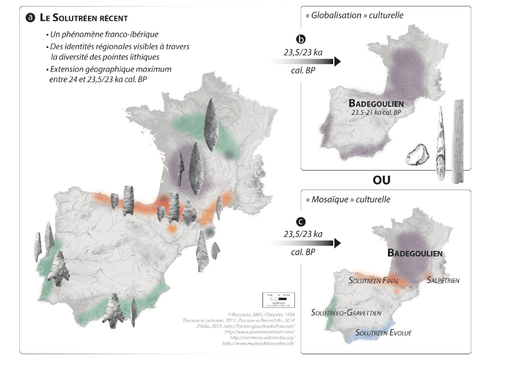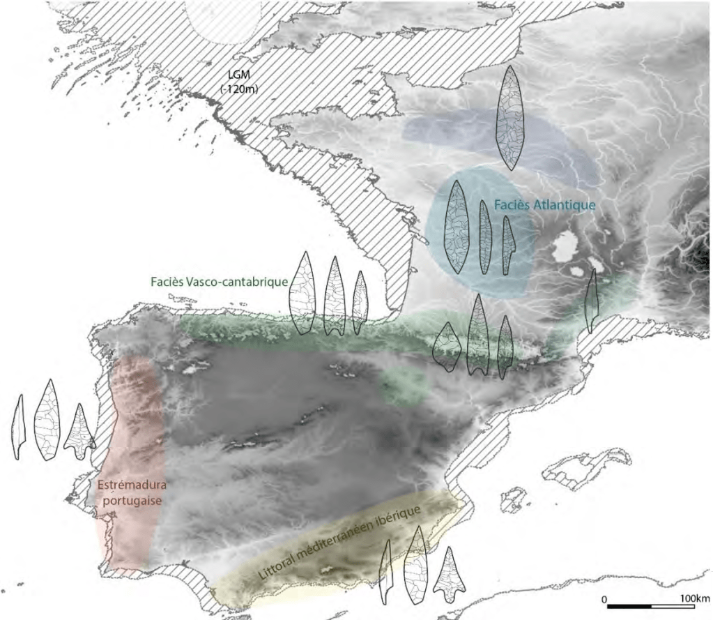 Selon certains chercheurs, le passage du Solutréen au Badegoulien, autour de 21 000 av. n. è. , se caractérise au nord des Pyrénées par un basculement net dans le sous-système technique lithique, impliquant a minima de possibles réorganisations des stratégies de mobilité des groupes concernés12 ; selon d’autres, le Solutréen perdure dans la zone pyrénéenne et ibérique jusqu’aux alentours de 19 000 av. n. è.13, tandis que le Badegoulien ne se développerait qu’au nord de l’Aquitaine. Toutefois, les récentes recherches effectuées à la grotte des Harpons (Lespugue)14, à Aitzbitarte IV15 ou à Llonin dans les Asturies16 remettent en cause cette dernière hypothèse puisque des occupations badegouliennes y ont été mises en évidence et, pour certaines d’entre elles, datées entre 21 et 19 000 av. n. è., c’est-à-dire en synchronicité parfaite avec les cadres nord aquitains17.