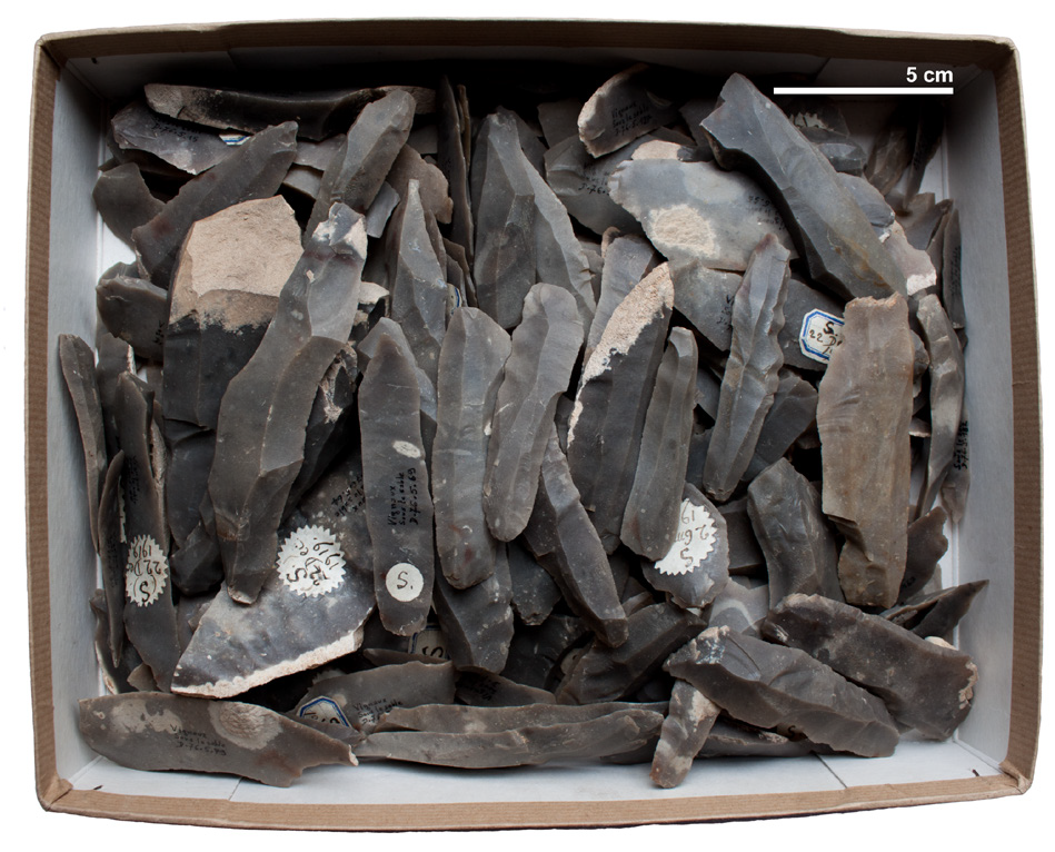 Parmi les comportements culturels originaux de cette période pour le versant nord-pyrénéen, citons la valorisation des grandes lames en silex. Elle se signale à la fois : 1) par la haute technicité des débitages normalisés et productifs et l’apprentissage des savoir-faire qu’elle sous-entend, 2) par la circulation des lames sur de grandes distances, leur utilisation comme support d’outil à longue durée de vie ou de nucléus à lamelles, mais aussi 3) par leur présence dans des dépôts en contexte de fond de grotte ornée22. Ce comportement singulier est particulièrement bien documenté dans les Hautes-Pyrénées et en Ariège, comme à Labastide, au Mas d’Azil et à Enlène23, mais aussi dans les Pyrénées-Atlantiques, à Tastet24, voire à Saint-Michel d’Arudy pour des supports de nucléus à lamelles25. Il s’agit de grandes lames en silex (15-25 cm de long), provenant en particulier du Campanien supérieur du Bergeracois, dont les sources sont localisées à environ 200-250 km au nord. Dans l’industrie osseuse, à côté de l’apparition de toute une série de nouvelles parures (contours découpés de têtes animales bien documentés dans l’espace pyrénéo-cantabrique26), le Magdalénien moyen récent est un moment de fort développement des décors gravés et sculptés qui envahissent les équipements. Comme pour les grandes lames, la signification culturelle de ces objets socialement investis nous échappe.
