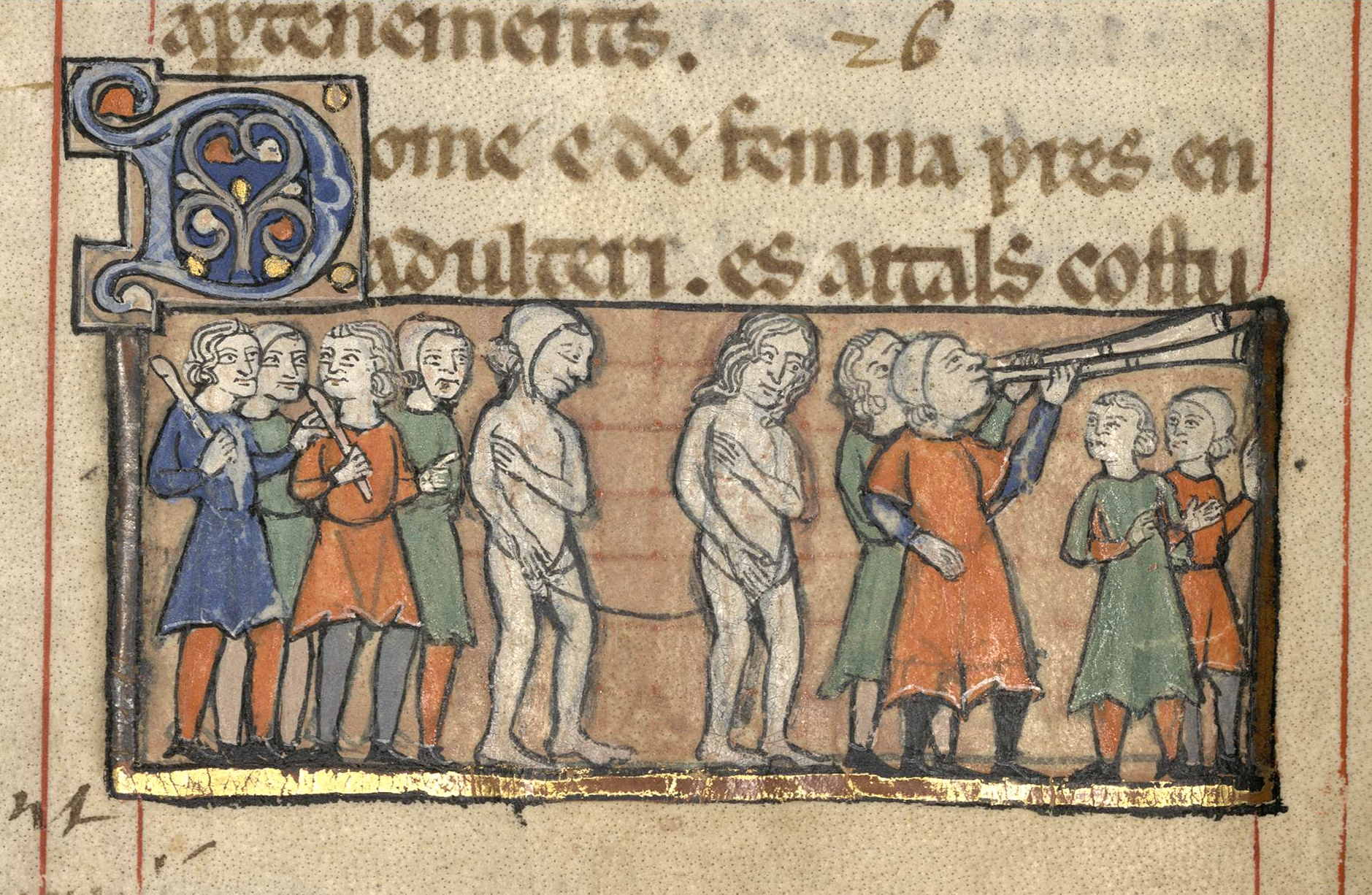 Ces coutumes se retrouvent avec des variantes dans toute la Gascogne. Bannis depuis longtemps du royaume de France, certains usages comme celui de la condamnation des amants adultères à courir nus dans la ville ont une dimension particulièrement infamante. Le Livre des statuts et des coutumes de la ville d’Agen, dont le manuscrit présente de beaux exemples d’enluminures gasconnes (voir la version numérisée sur le site des Manuscrits médiévaux d’Aquitaine), conserve la seule figuration connue de cette scène humiliante dans laquelle – originalité agenaise – les amants sont attachés l’un à l’autre par le sexe.