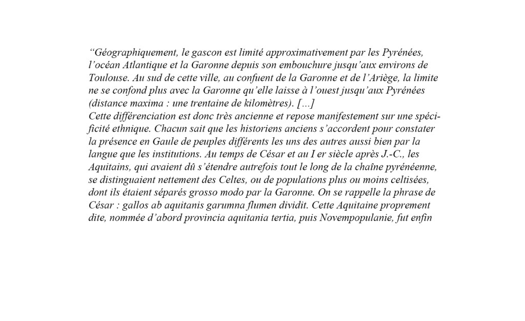 Le gascon est […] la forme qu’a prise le latin de Gaule dans une aire comprise grosso modo entre les Pyrénées, le littoral atlantique et le cours de la Garonne au nord de Toulouse, la limite entre lui et le languedocien courant ensuite au sud de cette ville pour atteindre la chaîne frontière en passant par le col de Port (Ariège). Cette limite parait très ancienne, puisqu’elle se confond à peu près avec celle que César assigne au peuple « aquitain », qui différait des Gaulois « par la langue, les coutumes et les lois »