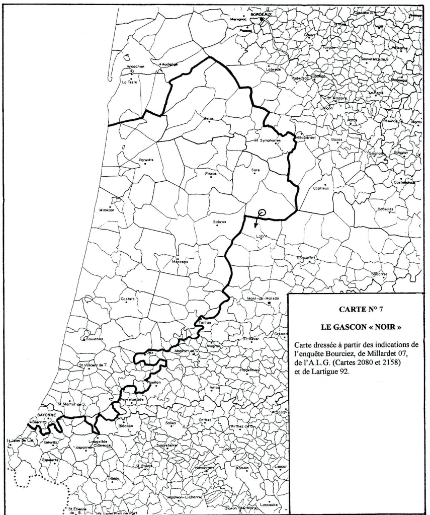 Nous émettons l’hypothèse que, à l’instar des faits que nous venons d’évoquer, le vocalisme à trois degrés du gascon occidental et du maritime « noir » est plutôt en régression, ou en état de survie, qu’en expansion. La forme que dessine la carte n° 7 semble montrer une poussée du vocalisme commun, d’origine orientale et qui se confond avec le reste du domaine d’oc, dans les zones les plus peuplées. Les contrées littorales, qui sont les plus éloignées des grands centres urbains, généralement propagateurs des changements et véritables détenteurs du prestige linguistique, sont aussi les moins peuplées et cela explique peut-être le renflement que dessine la carte au nord-est de la zone, qui est un véritable désert humain commençant aux portes de Bordeaux et s‘étendant sur des dizaines de kilomètres vers l‘ouest et le sud.