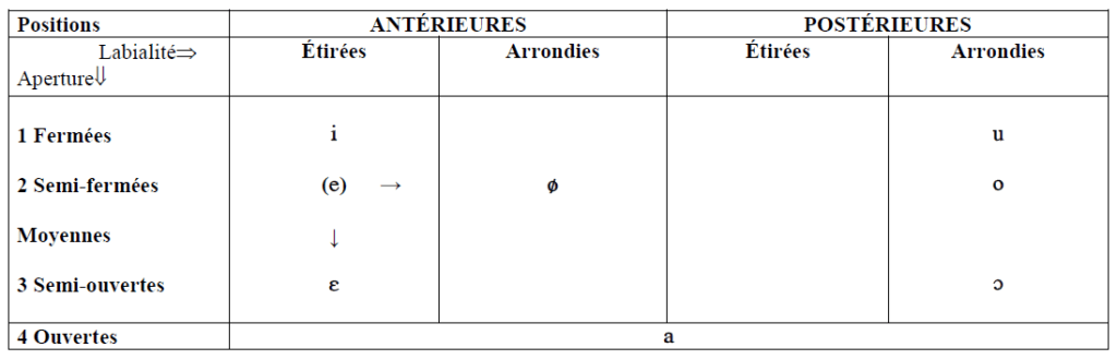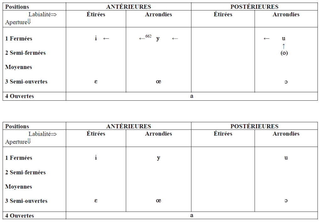 L’hypothèse selon laquelle la palatalisation /u/ > /y/ serait plus tardive en gascon est très plausible. Cette évolution, qui ne serait intervenue qu’à partir du XIIIe siècle, aurait ainsi rééquilibré le système vocalique qui est encore celui que nous connaissons aujourd’hui et dans lequel /œ/ a finalement acquis le rang de phonème. La troisième phase a donc pu être la suivante :