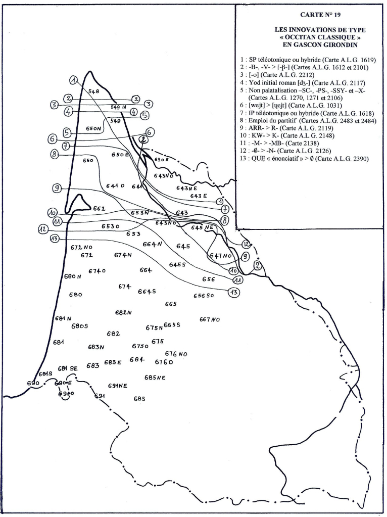 Les cartes linguistiques montrent que le « semi-noir » médoquin est pris dans l’étau formé par le Bas-Médoc et le Bordelais. Il donne en cela l‘impression d’une zone de conservatisme qui se serait détachée de l‘aire « noire », son pendant méridional à trois degrés d’aperture, et en serait séparée par le pays de Buch, toujours très influencé par la métropole bordelaise. Édouard Bourciez37 note que l’idiome gascon a subi, venant de l’est et s’exerçant surtout par l’intermédiaire de Toulouse, une très forte pression languedocienne qui a en partie désorganisé sa morphologie et introduit beaucoup d‘innovations. Haudricourt parle à ce sujet d‘adstrat et de superstrat occitan en gascon38. Nous revenons ici à notre hypothèse selon laquelle cette pression aurait été, au moins autant, originaire d’outre-Gironde à l’époque où cette région était encore occitanophone et avant que le centre de gravité de la koinè ne rejoignît le Languedoc. Ronjat écrit que la langue d’oc arrivait au Moyen-Âge jusqu’au nord de Barbezieux39 et Allières laisse entendre que la Saintonge n’était plus occitanophone au XIIIe siècle40, ce que confirme Wartburg qui précise que cette dernière région et le Poitou étaient francisés au XIIe siècle41. Les traits provençaux, au sens ancien du terme, 1, 2, 3 et 4 ne se retrouvent nullement dans les dialectes du Bordelais et sont limités au seul Bas-Médoc. Quant au trait 7, il n’affecte que l’Entre-deux-Mers et laisse Bordeaux à la rhizotonie. Encore ne parlons-nous pas ici des traits spécifiques gascons que le Bordelais, Médoc compris, ignore. La carte n° 19 présente les isoglosses de ces innovations en Gironde. Nous pouvons penser que le Bas-Médoc n’a jamais procédé à la neutralisation de l’opposition [e] ~ [ɛ]. Ces exemples, qu’on pourrait multiplier pour le reste de la Gascogne, vont contre la thèse de la fragmentation dialectale régulièrement soutenue pour le gascon par rapport à l’occitan42. Cette opinion est aussi battue en brèche par Chambon et Greub qui écrivent « Cette langue (le gascon) s’est coordonnée ensuite, sociolinguistiquement et, dans une certaine mesure, linguistiquement au provençal43 ». Allières énonce également que le gascon est un ensemble très original qui s’est rapproché, au cours des siècles, du modèle languedocien44. Ces remarques faites au sujet du consonantisme sont-elles valables pour le vocalisme ? Un vocalisme innovant, plus proche du modèle « provençal », aurait-il émergé à la suite d’une phase proprement autochtone, au moins pour la partie occidentale du domaine ?