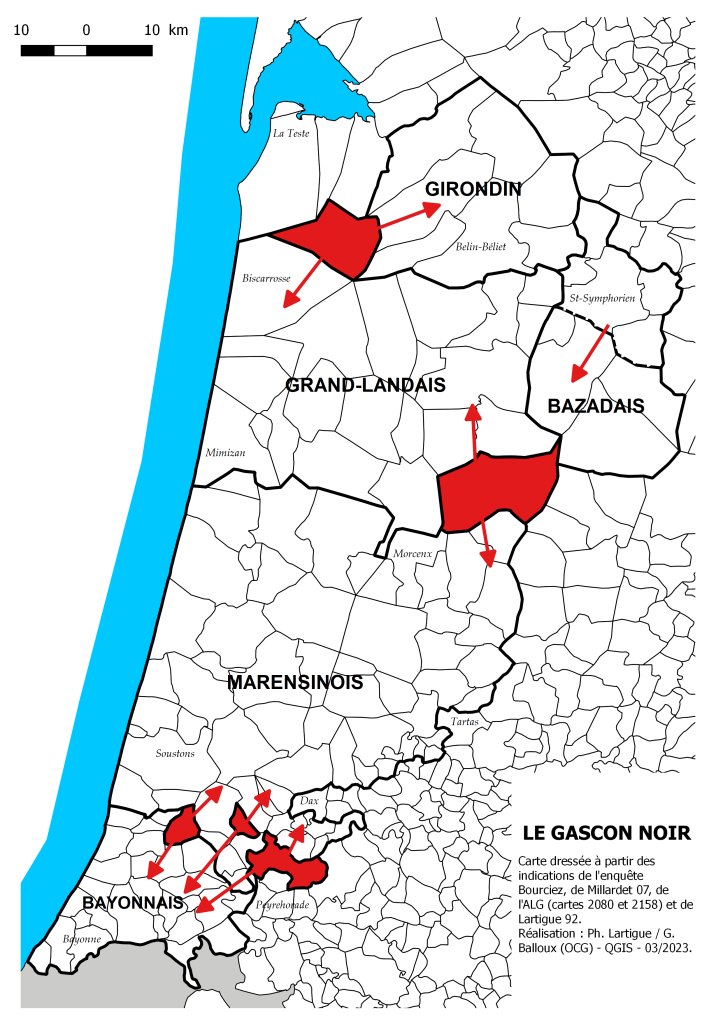 - Le gascon « noir » girondin occupe le sud-est du Pays de Buch et le sud-ouest des landes de Cernès. Ce sont les communes du Barp, Belin-Beliet, Hostens, Lugos, Mios, Salles et Saint-Magne.