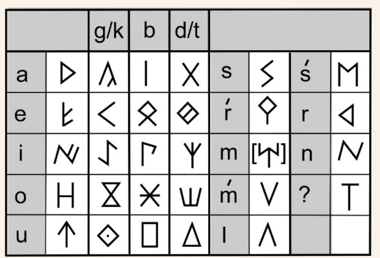 Tout d’abord, nous devons clairement indiquer quelles sont les limites de l’alphabet paléo-hispanique du nord-est. Le fait de dire « alphabet » n’est pas tout à fait approprié, bien que certains signes représentent des sons simples (voyelles a, e, i, o, u ; nasales n, m ; sifflantes ś, s ; liquides r, ŕ, l), d’autres représentent des syllabes ouvertes, à savoir ba, be, bi, bo, bu, ta, te, ti, to, tu, ka, ke, ki, ko, ku.