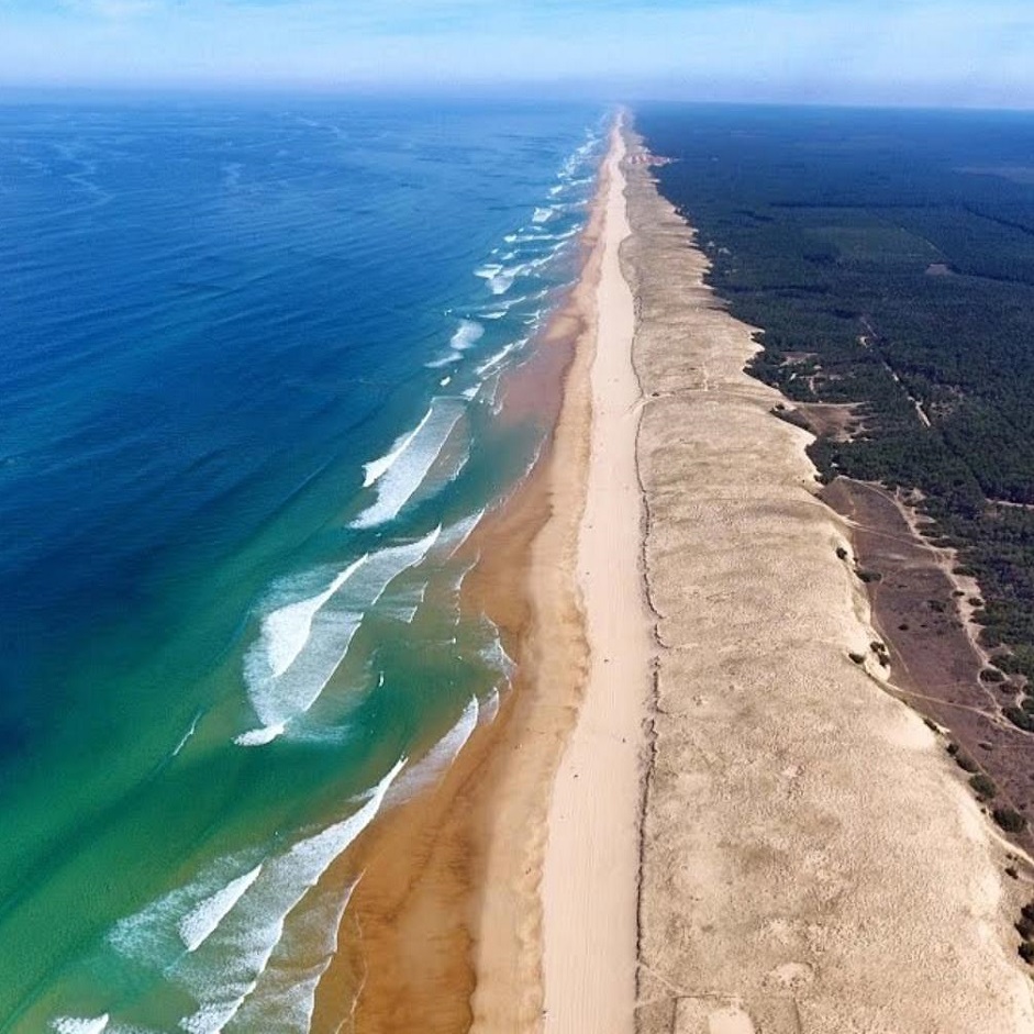 De la Pointe de Grave au nord au Cap Saint-Martin au sud, la côte sableuse landaise se distingue des autres littoraux français par la présence d’un massif dunaire exceptionnel, long de 230 km et large de 2 à 10 km, dont une majeure partie est boisée. L’embouchure du Bassin d’Arcachon, entre la Dune du Pilat et le Cap-Ferret constitue la principale échancrure dans ce cordon sableux quasi-rectiligne et légèrement incliné de 10° par rapport à l’axe nord-sud.